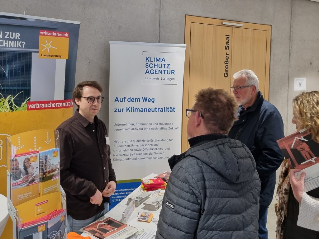 Darüber hinaus informierten sich zahlreiche weitere Besucher:innen während der Vorträge und an den übrigen Messezeiten intensiv an den Infoständen. Auf der zweitägigen Messe waren zahlreiche regionale Akteure vertreten – darunter Heizungsbauer, Energieberater sowie die Verbraucherzentrale Baden-Württemberg e.V. und die Klimaschutzagentur des Landkreises Esslingen gGmbH. Ein starkes Netzwerk für eine starke Umsetzung.